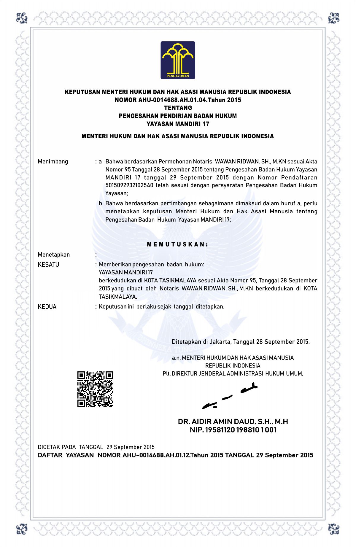 Berikut adalah SK AHU KEMENKUMHAM YAYASAN MANDIRI 17